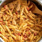Now it’s time to bring it all together! Add the drained diced tomatoes and your cooked penne pasta to the skillet. Toss everything together until the pasta is well coated in that delicious creamy sauce. Allow it to heat through, and you’re almost ready to enjoy!
