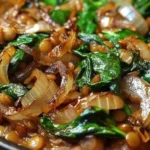A hearty and nutrient-rich skillet dish featuring caramelized onions, lentils, and fresh spinach, embodying the warmth of home-cooked meals.