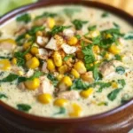 A comforting bowl of creamy soup that captures the vibrant flavors of traditional elote.