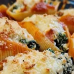 Imagine a plate brimming with oversized pasta shells filled to the brim with a creamy, dreamy ricotta and spinach mixture, all enveloped in luscious marinara sauce. Each bite offers a delightful contrast of textures and flavors; the rich, soft filling balances perfectly with the tangy sauce, and the gooey melted mozzarella on top brings everything together in cheesy perfection. It’s the ideal dish whether you’re simply winding down after a long day or entertaining friends on a chilly evening.