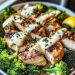 A hearty and nourishing meal featuring grilled chicken and roasted broccoli, drizzled with a creamy garlic sauce, perfect for busy weeknights.