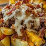 Imagine diving into a plate piled high with golden-brown fries, topped with seasoned ground beef, melty cheddar cheese, and crispy bacon crumbles, all drizzled with tangy ranch and ketchup. The moment you take a bite, the crunch of the fries meets the richness of the beef, and your taste buds sing with delight. Get ready to indulge in this glorious creation that’s perfect for game day, family movie night, or any occasion that calls for a tasty treat!