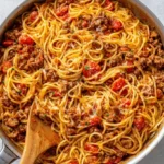 A hearty and satisfying one-pot meal featuring seasoned ground beef, zesty tomatoes, and al dente spaghetti, perfect for busy weeknights.