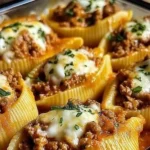 A comforting dish of jumbo pasta shells filled with a savory blend of ground beef, creamy ricotta, and melted mozzarella, topped with marinara sauce.