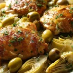 A comforting dish of tender chicken thighs simmered in a savory sauce with olives and artichokes, perfect for weeknight dinners.
