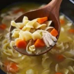A warm, hearty soup made with shredded turkey and egg noodles, perfect for busy days.