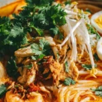 A comforting coconut-rich noodle soup bursting with vibrant flavors, perfect for rain-soaked afternoons.
