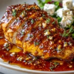 A comforting dish featuring succulent chicken breasts coated in a spicy-sweet glaze with feta cheese.