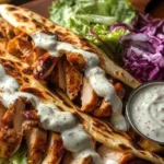 A flavorful version of the classic Middle Eastern chicken shawarma, featuring marinated chicken and a creamy garlic sauce.