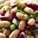A colorful and nutritious Three Bean Salad packed with plant-based protein and fresh vegetables, dressed in a tangy sweet vinaigrette.